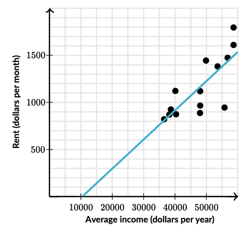 The scatterplot and regression line below show the average income, in dollars, in several major American cities plotted against the rent for a 222-bedroom apartment in those cities.