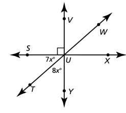 (Since 7x + 8x = 90, then x = 6. Angle WUX is vertical to angle TUS, so they have the same measure.)