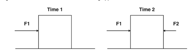 IN TIME 2, F1 HAS 80N GOING EAST, AND F2 HAS 30N GOING WEST. WHICH DIRECTION WILL HAVE A GREATER ACCELERATION BASED ON THE NET FORCE?