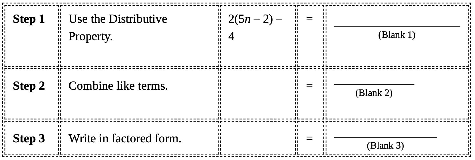 Fill in all three blanks to complete the steps to show how to simplify 2(5n - 2) - 4 and express the result in factored form.