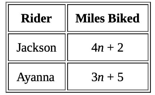 The expressions in the table represent how far two friends rode their bicycles on a bike trail. What is the expression that would show the DIFFERENCE between miles ridden by Jackson and the miles ridden by Ayanna.
