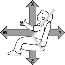 Which letter shows the direction of the force the seatbelt will exert on the man when he slams his breaks?