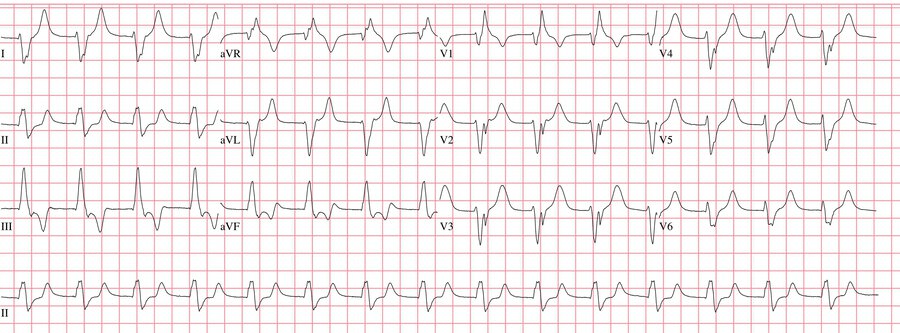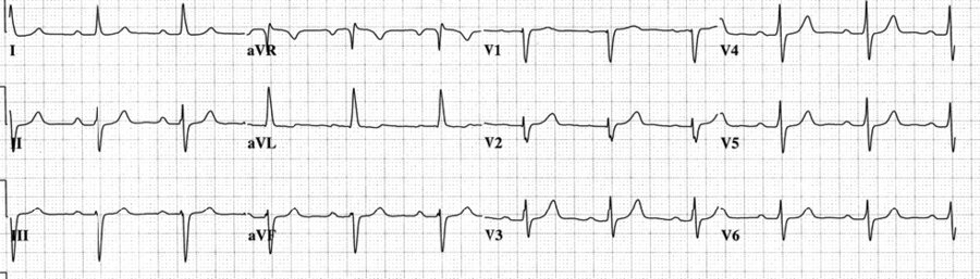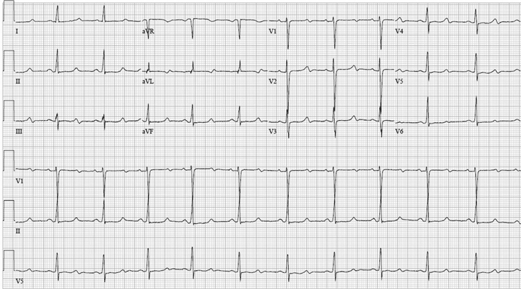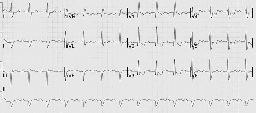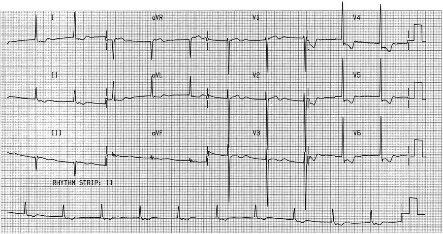 Which of the following abnormalities is demonstrated on this patient's ECG?