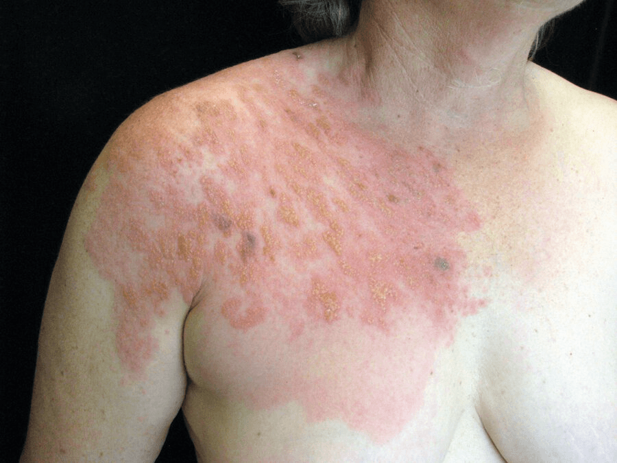 A 65-year-old woman is evaluated for severe pain on the right side of the upper chest of 1 week's duration and was followed by the appearance of the rash shown.