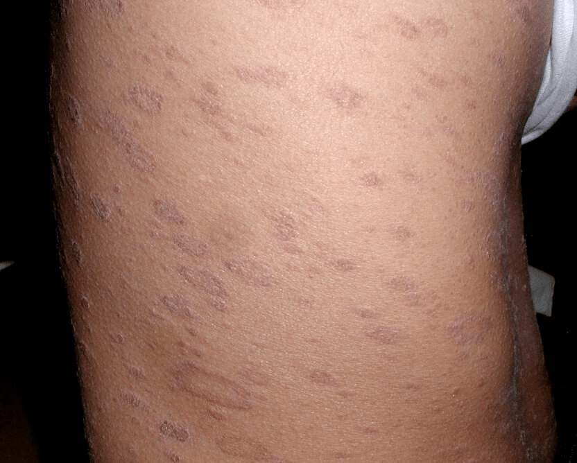 Representative lesions on his lateral thigh are shown. Name that rash!