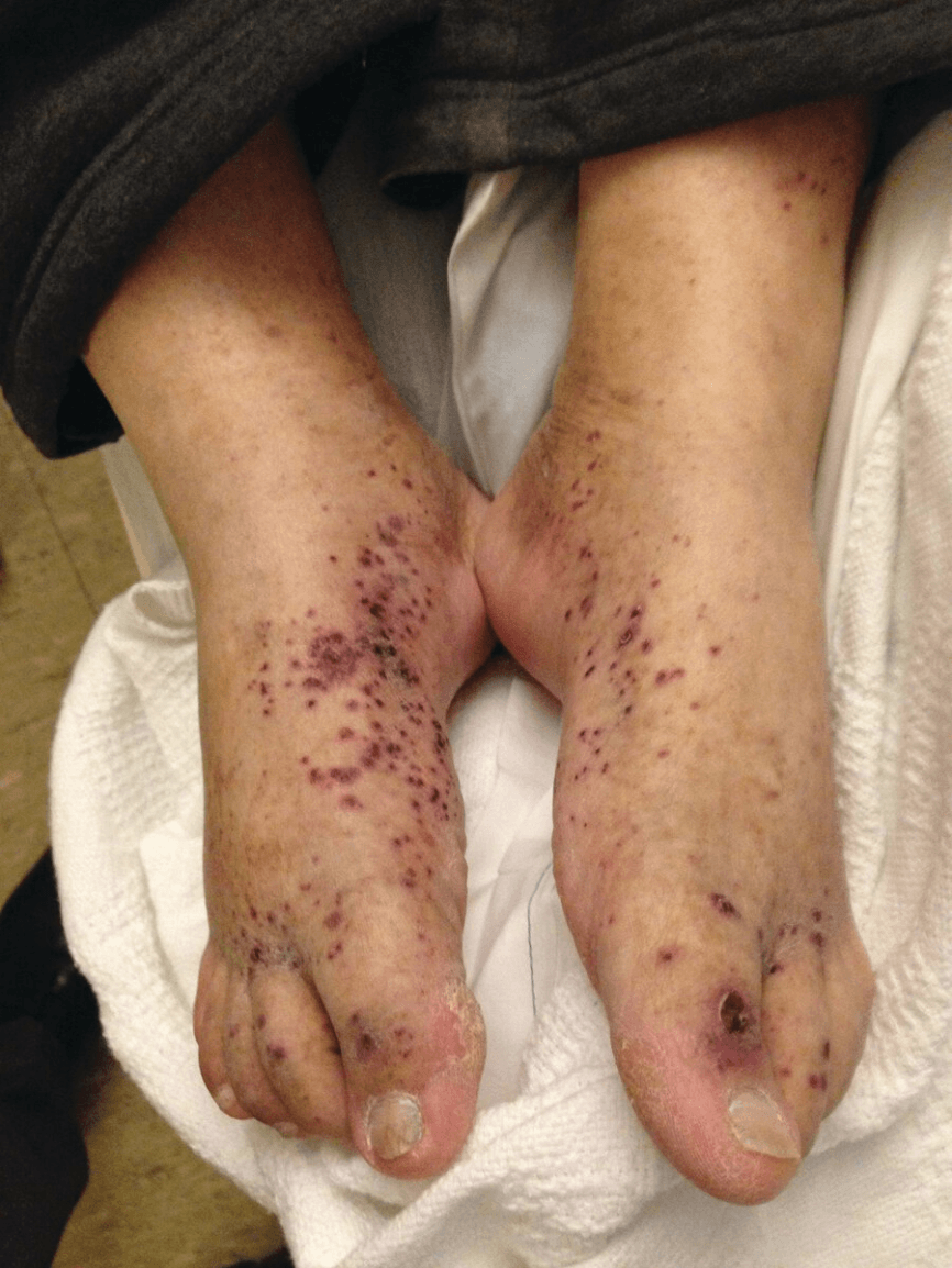 A 26-year-old man is evaluated for the acute eruption of the palpable lesions shown.