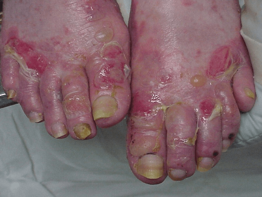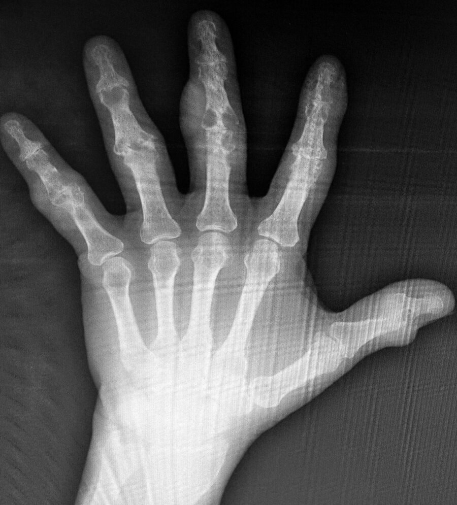 A 52-year-old man is evaluated for chronic pain in the joints of the hands, ankles, and toes.