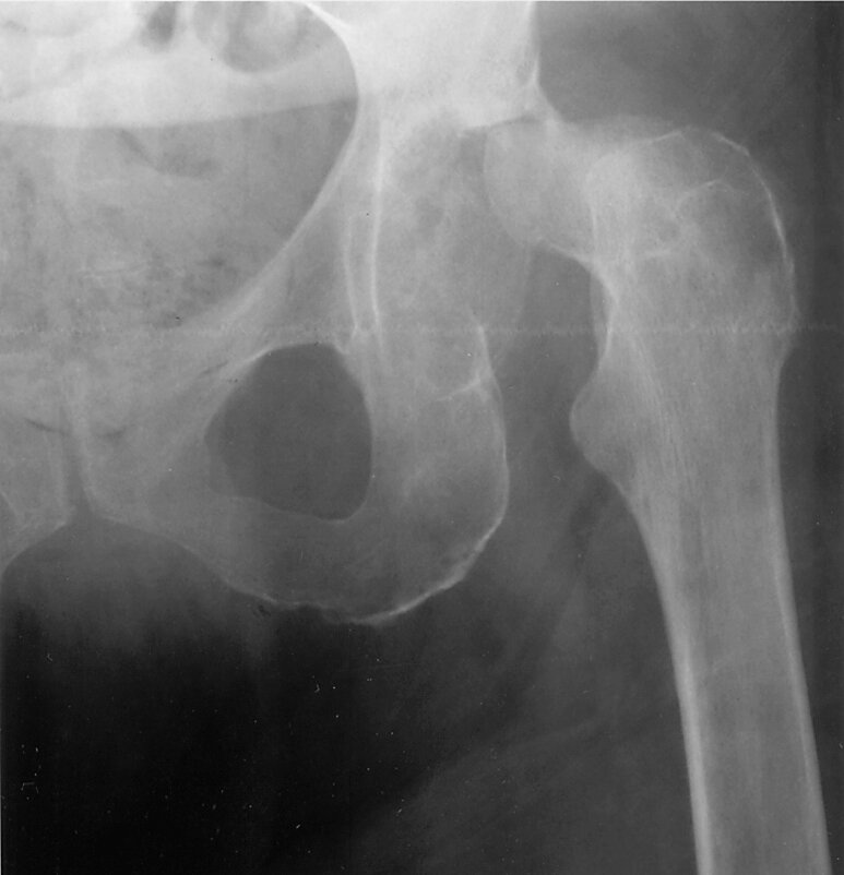 A 45-year-old man with a history of rheumatoid arthritis is evaluated for fever and left hip pain that has become progressively severe over the past 6 weeks.
