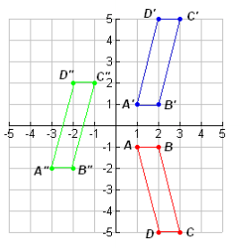 Identify the sequence of transformations taken to get from the red figure, to the blue figure, to the green figure.