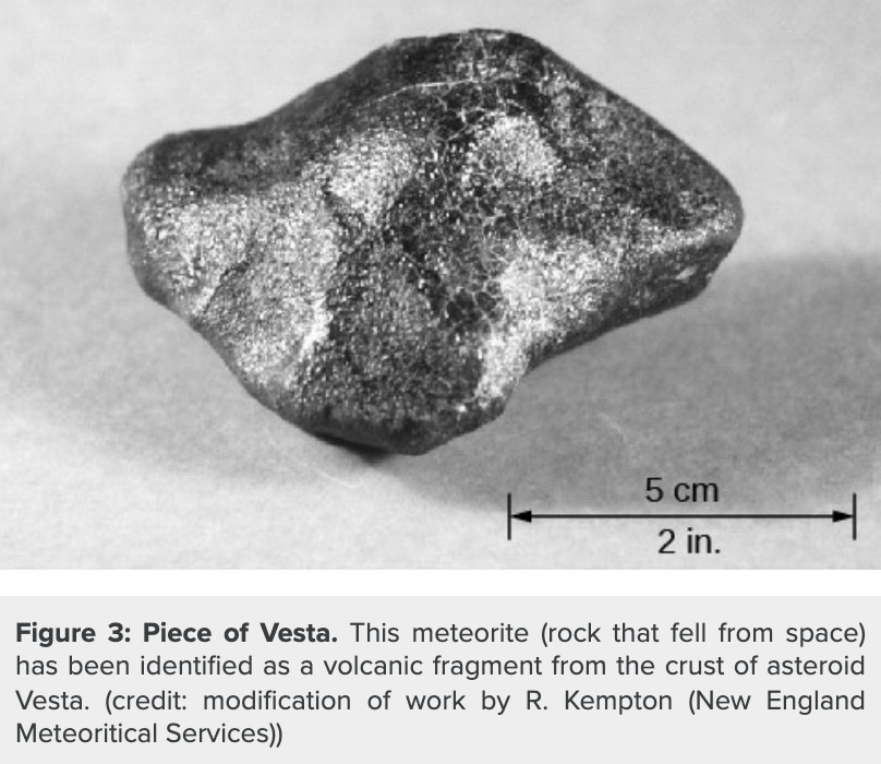 Vesta is one of the most interesting of the asteroids. It orbits the Sun, and its relatively high reflectivity of almost 30% makes it the brightest asteroid, so bright that it is actually visible to the unaided eye if you know just where to look. But its real claim to fame is that its surface is covered with basalt, indicating that Vesta must once have been volcanically active, in spite of its small size (about 500 kilometers in diameter). Meteorites from Vesta’s surface (Figure 3), identified by comparing their spectra with that of Vesta itself, have landed on Earth and are available for direct study in the laboratory. We thus know a great deal about  this asteroid.