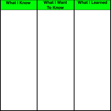 A graphical organizer designed to help you learn by asking the questions what do I already know, what do I want to know and what I have learned.