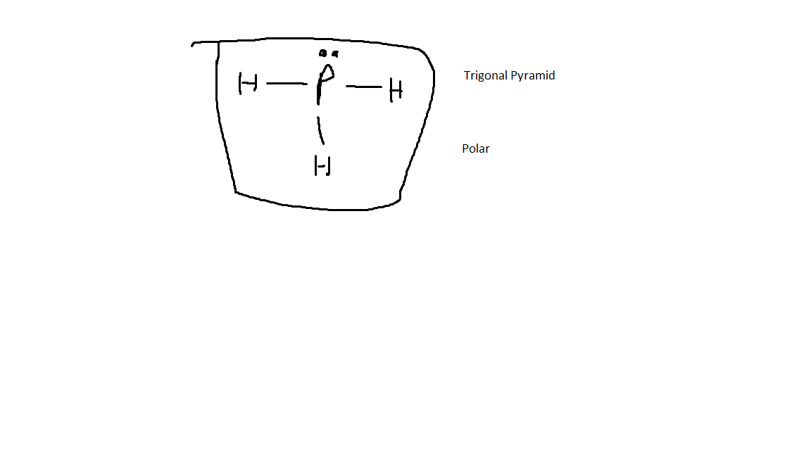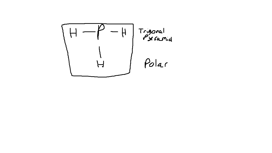 The Lewis Dot Structure for PH3, its VSEPR shape, and its polarity.