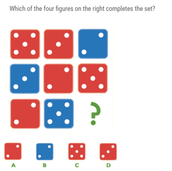 D. Each line contains two red dice and one blue die. Each line contains a two, a three and a five. The missing image is of a red die, number three.