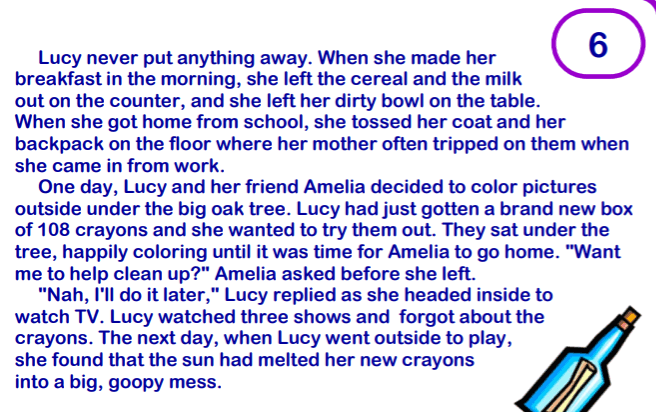 Put things away when you are done using them. Always clean up after yourself. You must be responsible for your things.