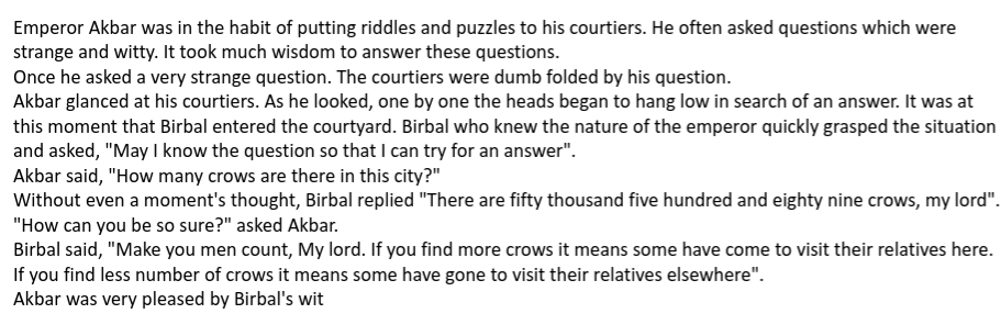 The Emperor liked to tell riddles, but his men didn’t know how to answer. So Birbal comes and answers the riddle. Then the Emperor is pleased.