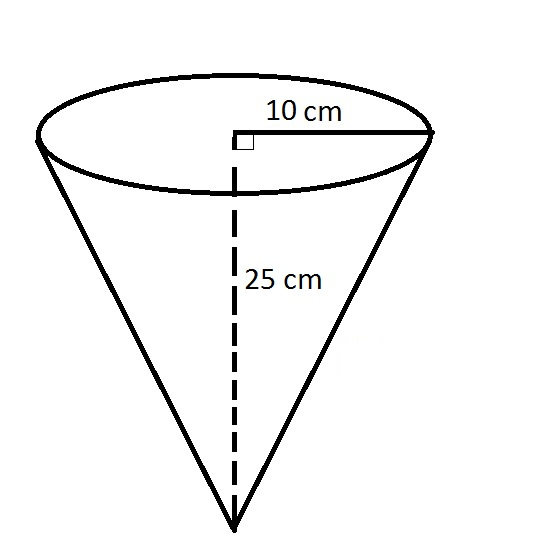 (1/3)pi(10^2)25= 2616.7 cm^3