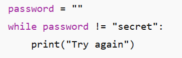 The password never changes inside the loop, so it repeats forever. You need to add password = input("Enter password: ") inside the loop.