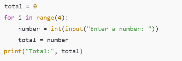 This program is supposed to add up 4 numbers entered by the user and then display the total. What is the problem with the code?