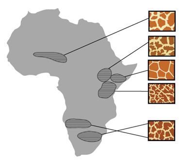The figure shows the different skin patterns found on an African giraffe species. What is the best title for this figure?