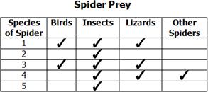 If the entire insect population migrated out of the spider's habitat, which two spider species would most likely become extinct if they could not adapt to this change?