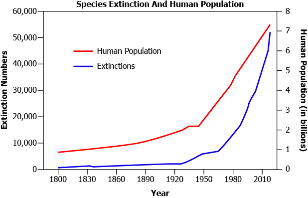 Predict what will likely happen to the number of species that go extinct if the trend of human population growth continues and reaches 8 billion by the year 2030.
