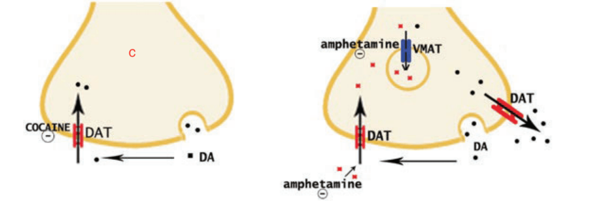 This drug of abuse directly prevents the re-uptake of dopamine, serotonin, and norepinephrine into pre-synaptic neurons