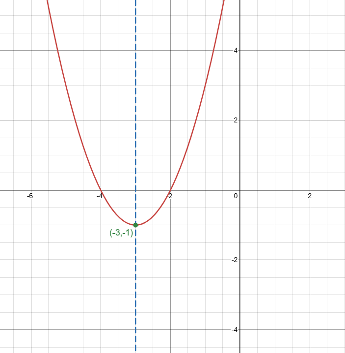 The graph of  h is the graph of  f(x)=x^2  translated 4 units left and 7 units down.  Write the function  h(x) in Vertex Form and in Standard form.
