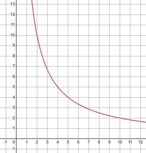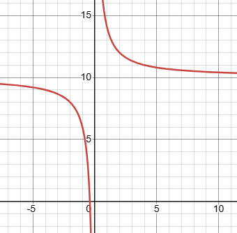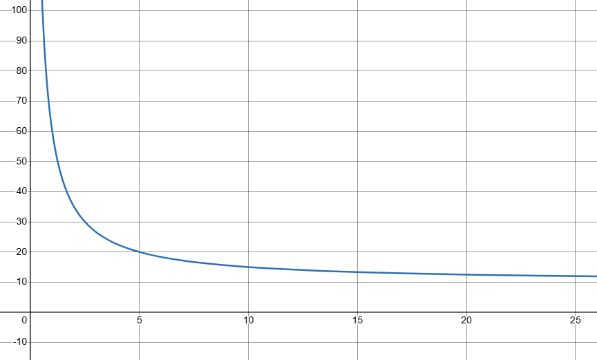 The graph shows the relationship between the number of attendees on a trip and the cost each has to pay. The van costs $50 and each person is responsible for a $10 ticket. Is there a horizontal asymptote at y=0?