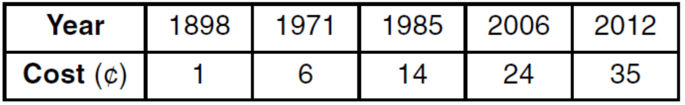 The table below shows the cost of mailing a postcard in different years. Between which 2 time intervals show the greatest average change?