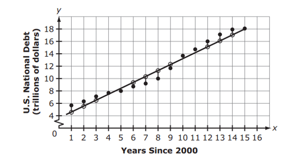 The scatter plot of the U.S. national debt from 2001 to 2016, including the line or best fit and its residuals is shown. The correlation's best description.