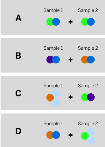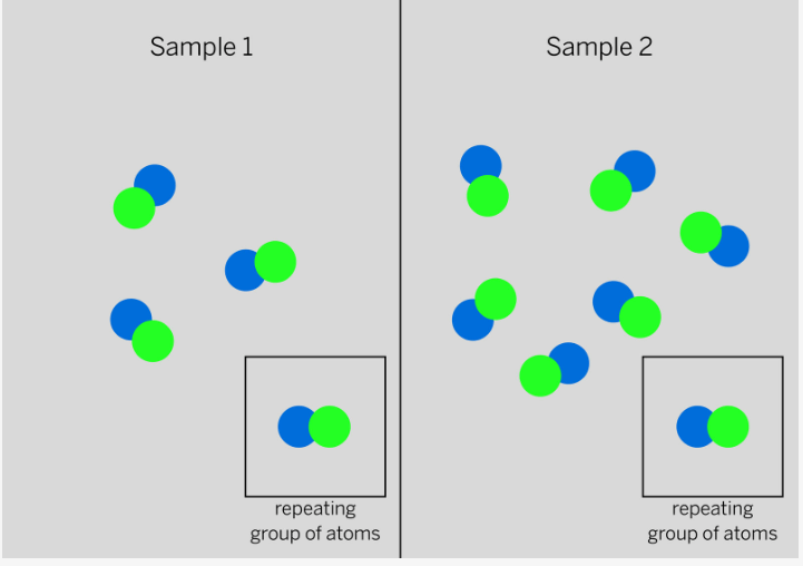 The diagram above shows the repeating groups of atoms that make up two samples. Both samples are green gases at room temperature. Will the other properties of the two samples be the same or different? (Examples of properties are smell, color, and the temperature at which a substance melts.)