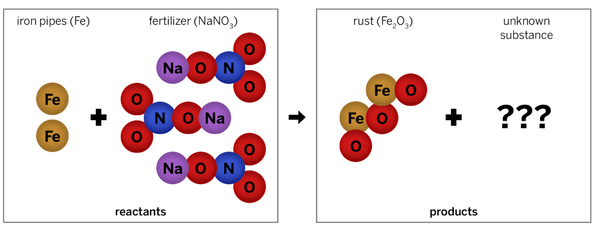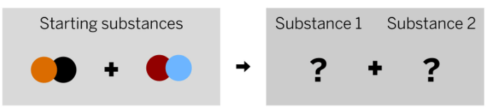 A chemist mixed two substances together: a blue powder with no smell and a colorless liquid with a strong smell. Their repeating groups of atoms are shown above on the left. After they were mixed, the chemist analyzed the results and found two substances. One ending substance had the repeating group of atoms shown above on the right.