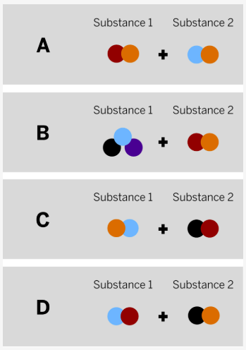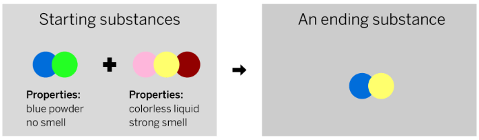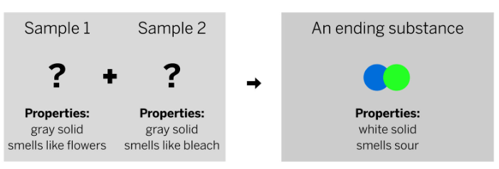 What is The ending substance is a different substance than the blue powder. It must be a different substance because the ending substance has one atom from the colorless liquid and one atom from the blue powder. A chemical reaction occurred because the blue atom from the blue powder and yellow atom from the colorless liquid rearranged to form the repeating atom group of the ending substance. The green, red, and pink atoms must have combined with one another to form another atom group.