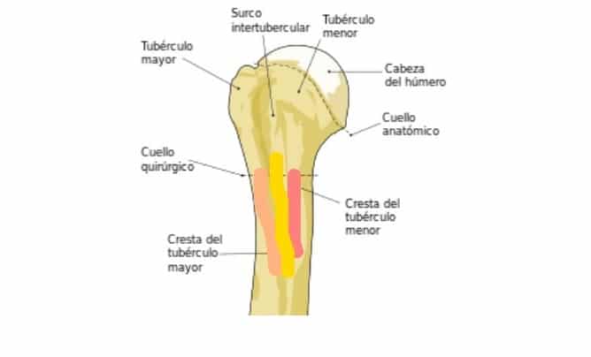 Cabeza humeral, troquiter, troquín, cuello quirúrgico y anatómico, canal bicipital, cresta del tubérculo mayor y menor.