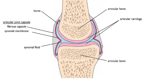 Label the synovial fluid, bursa, articular cartilage, articular capsule, fibrous capsule, and synovial membrane of a joint.