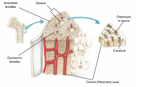Label the following parts of a bone: osteon, osteocyte, concentric lamellae, interstitial lamellae, and canaliculi