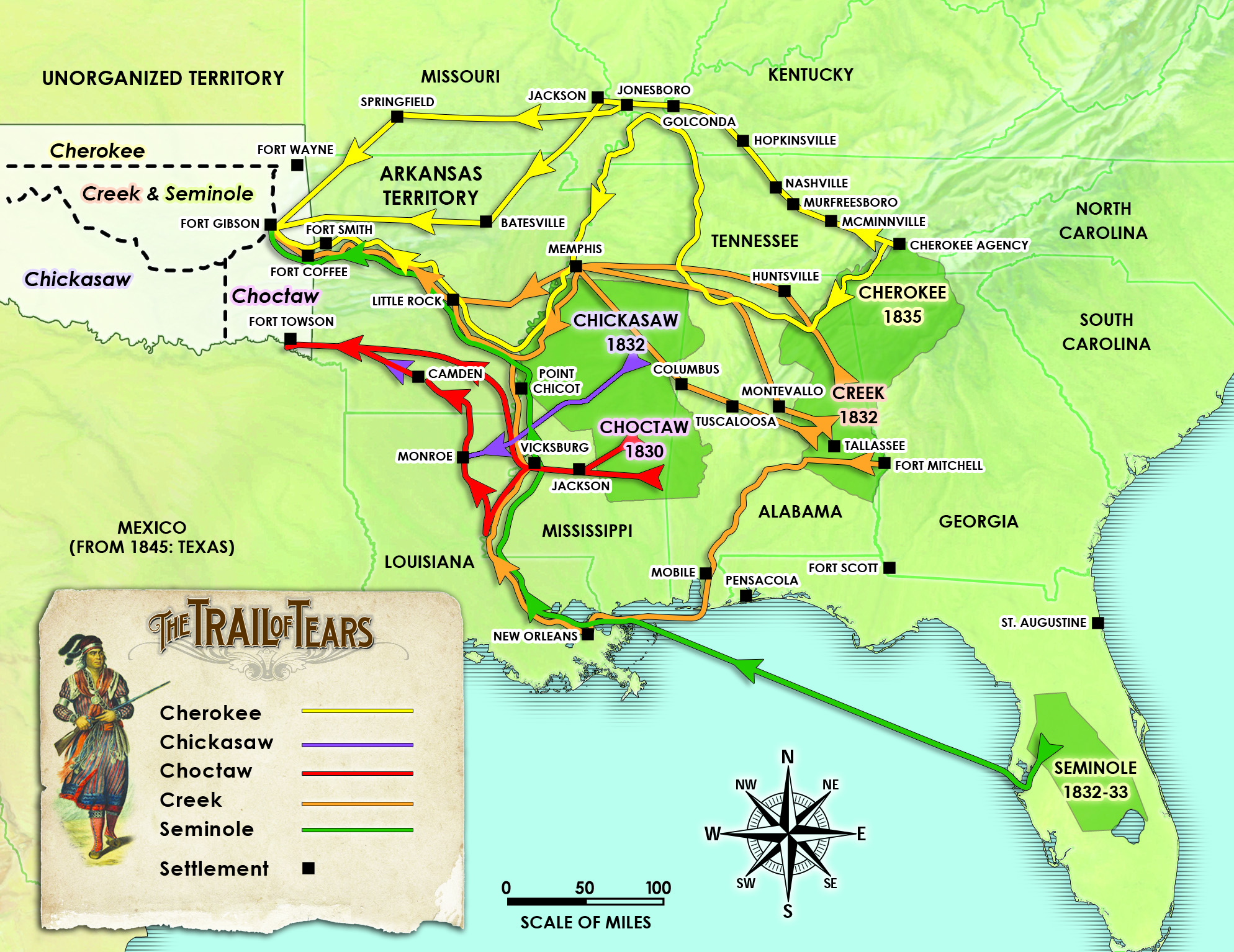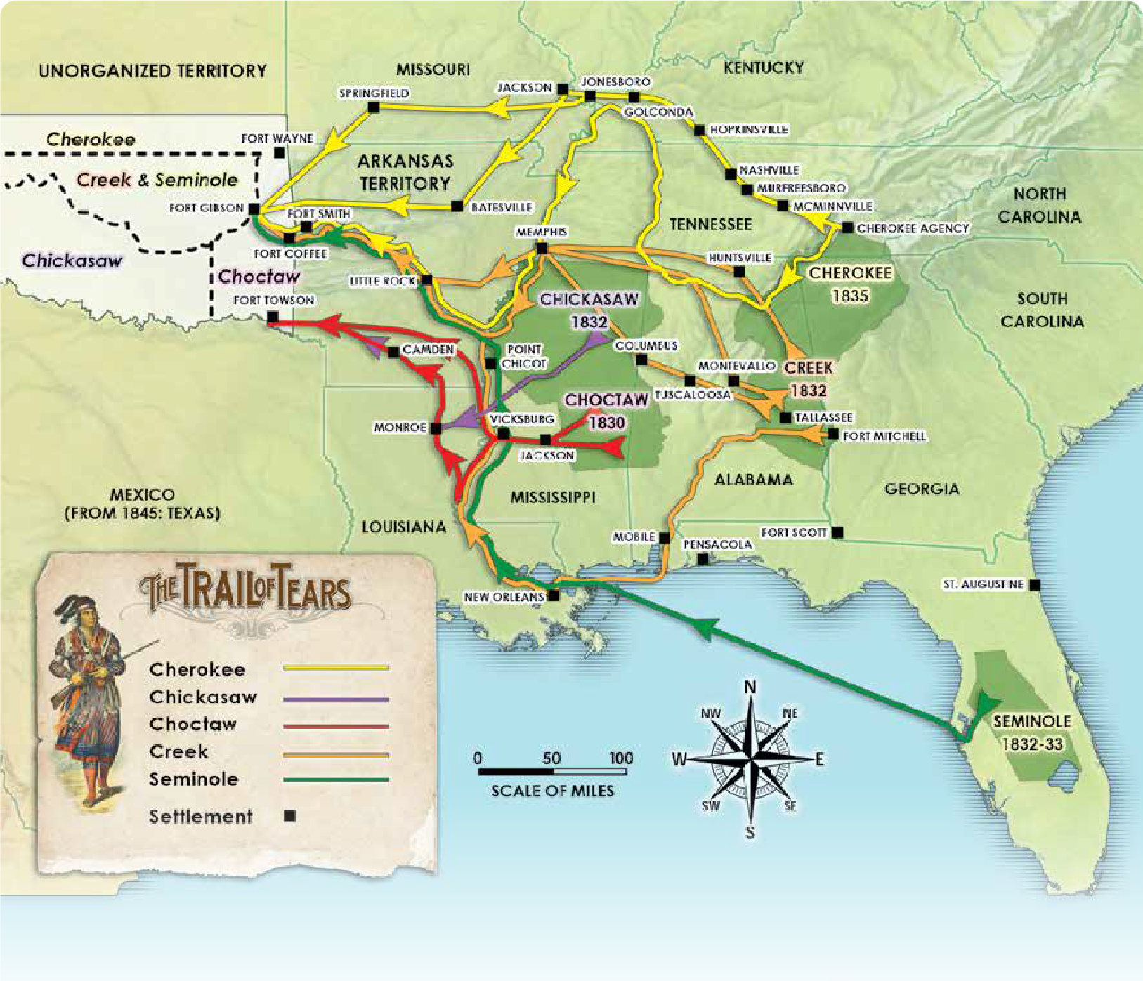 Study the map of the Trail of Tears. Locate the route of the Seminole.