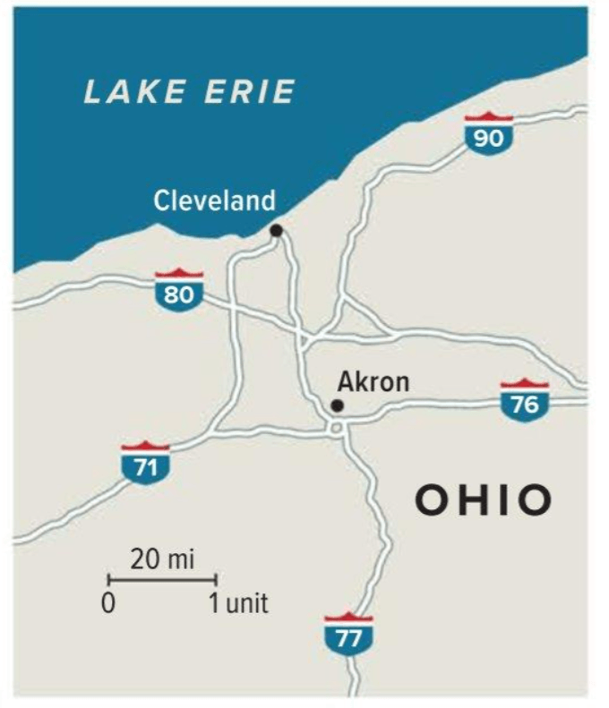 The distance between Akron and Cleveland is 2 units. The actual distance of the cities is what