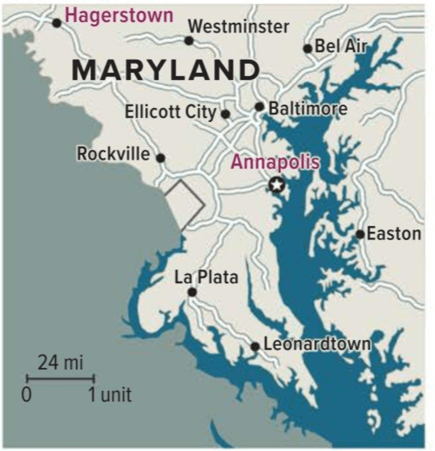 The distance between Baltimore and La Plata is 3 units. The actual distance between Baltimore and La Plata is