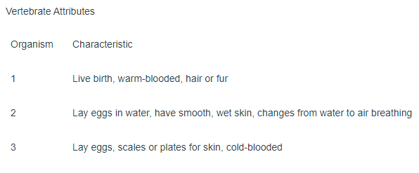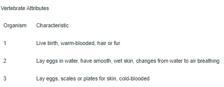 The table shows the attributes of three different groups of vertebrates. Using the information, name each group, in the order within the table.