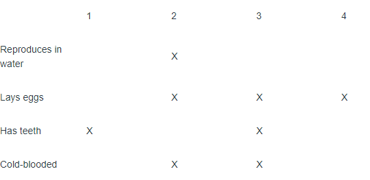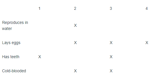 A student finds the following animals in his garden: frog, snake, snail, and lizard. He classifies the snail in one group and the other animals in a second group.
