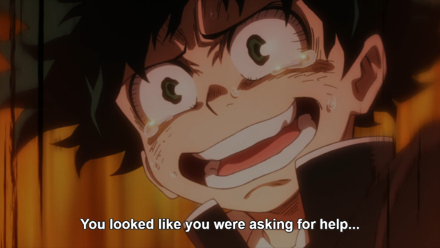 In S1 Ep2, Bakugo is caught and trapped by a slime monster. Deku instinctively runs over to help him despite having no quirk. When Bakugo asks why Deku runs over, what does Deku say that inspires All Might to save them both?