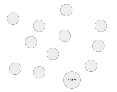 The circles in the image represent places on a map that you would like to visit. Your goal is to find the most efficient way to begin at the location marked "Start" and visit each place without visiting the same place twice. If you used an algorithm, this would be the runtime.