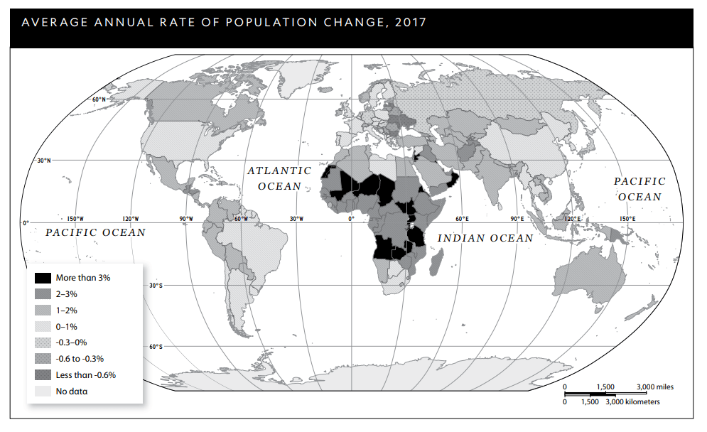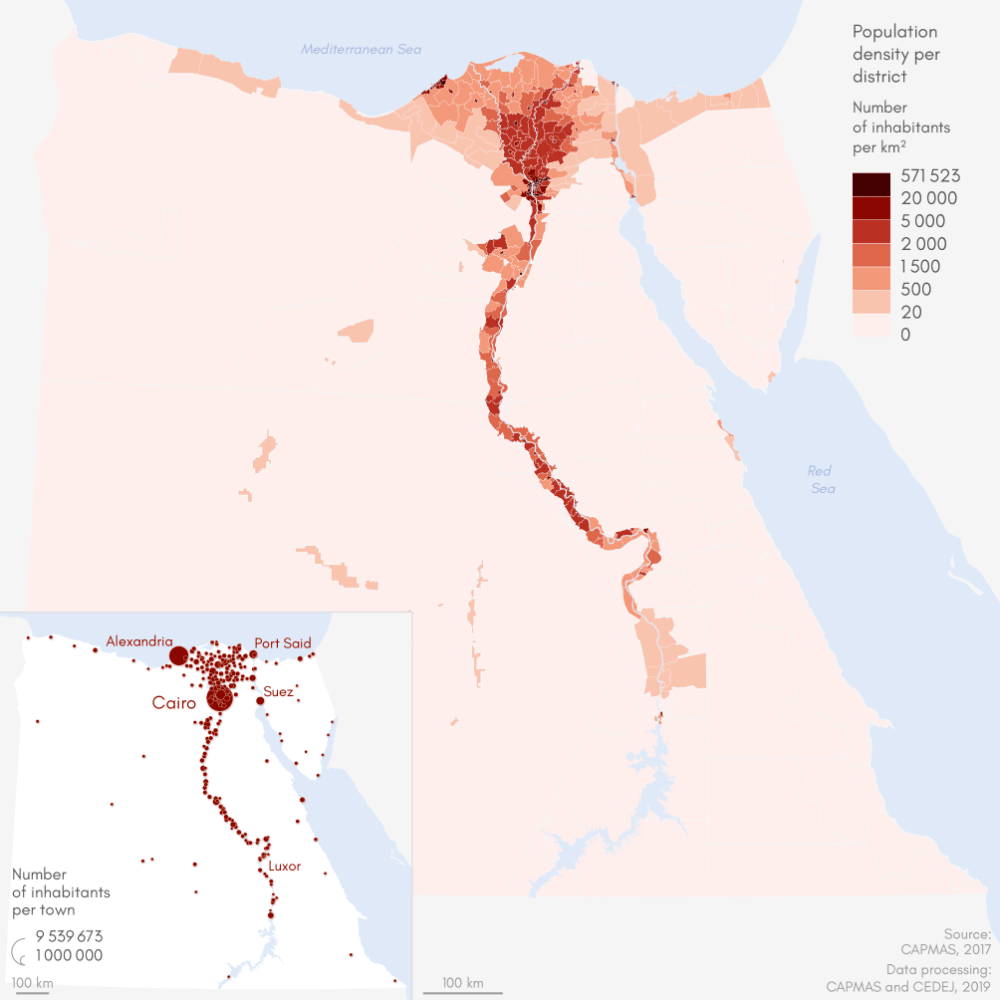 The map shows that millions of people are crowded onto a small strip of arable land along the Nile River.