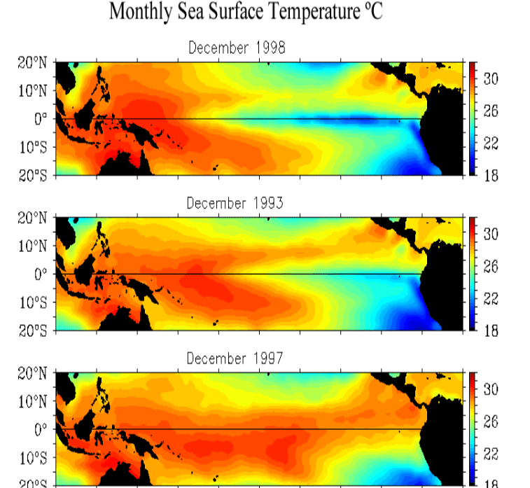 La Niña: Normal conditions enhanced. Increase upwelling along the coast of SA. Rainier in A. Dryer in SA.