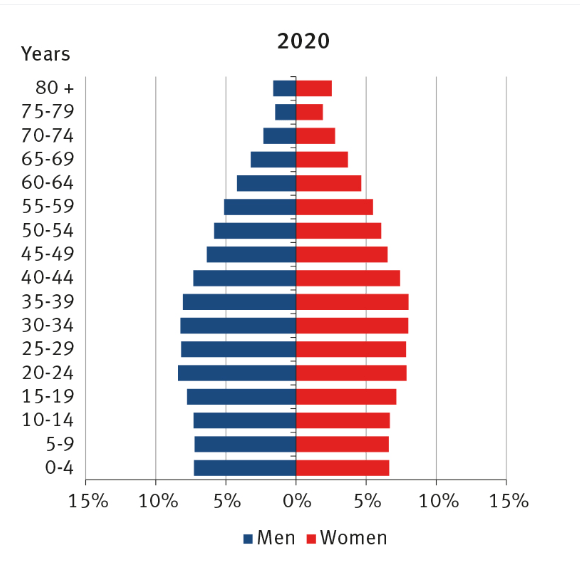 Which stage of the DTM is pictured here for Brazil, narrowing base and bulging 20–39 cohort?