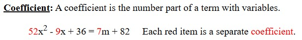A coefficient is the number part of a term with variables. It is the variable's "co-worker," because they multiply.