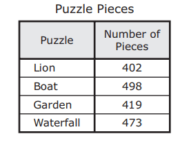 The table shows the numbers of puzzle pieces in four puzzles. Derek put together the two puzzles that had the greatest numbers of pieces.