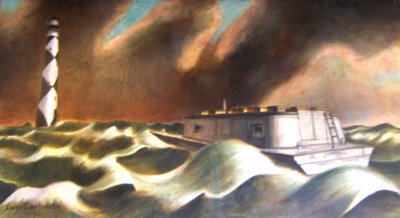 The former post office in Beaufort is home to four paintings by Simka Simkhovitch. One of the pieces shows a lighthouse with a black-and-white diamond pattern, and a ship delivering mail to which location?
