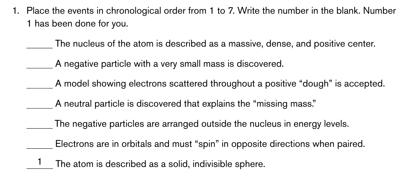 Dalton, Thomson, Rutherford, Bohr, Heisenberg.